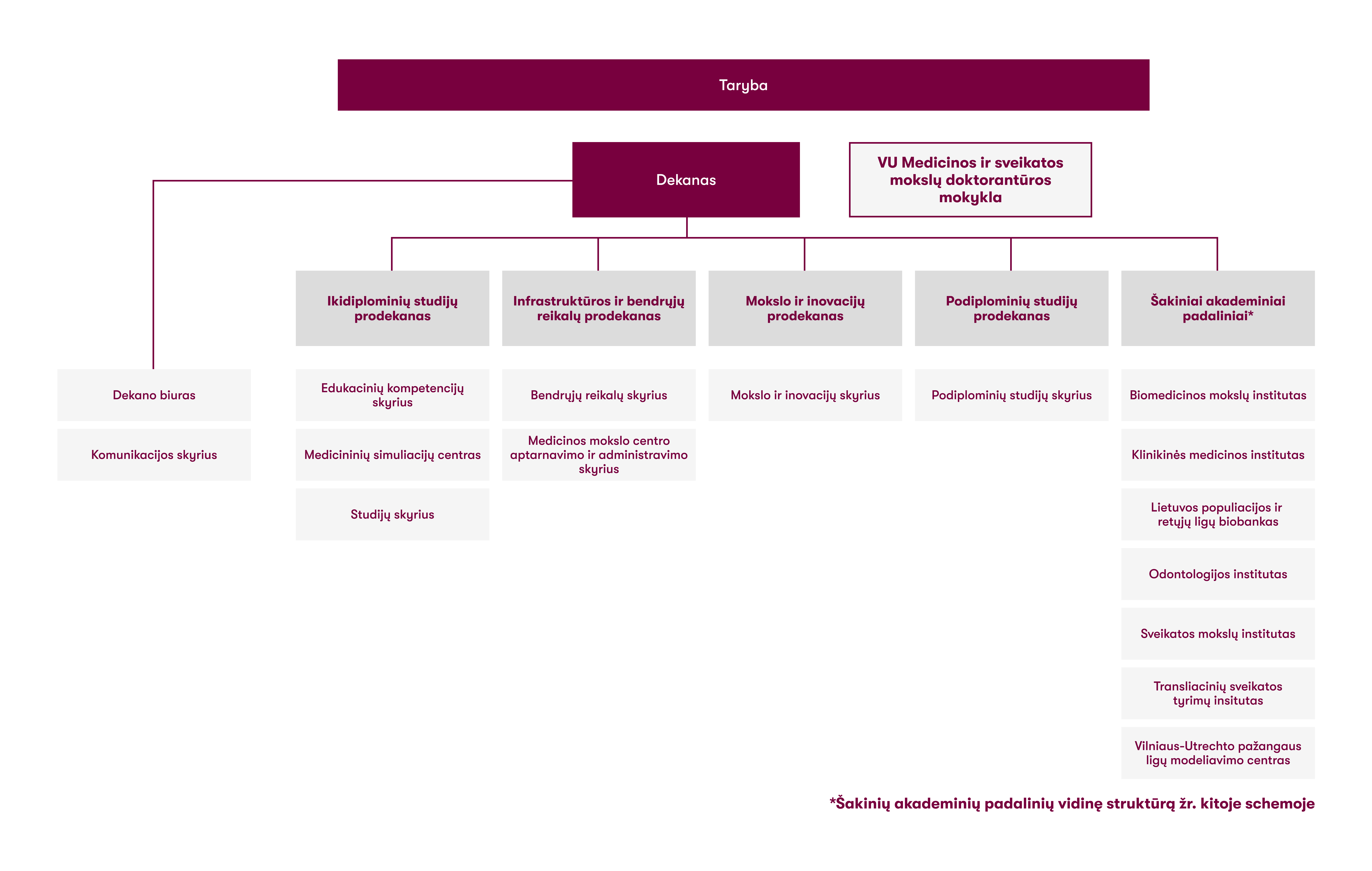 Medicinos fakulteto bendrą struktūros schemą galite peržiūrėti / parsisiųsti čia. Medicinos fakulteto Šakinių akademinių padalinių vidinės struktūros schemą galite peržiūrėti / parsisiųsti čia.