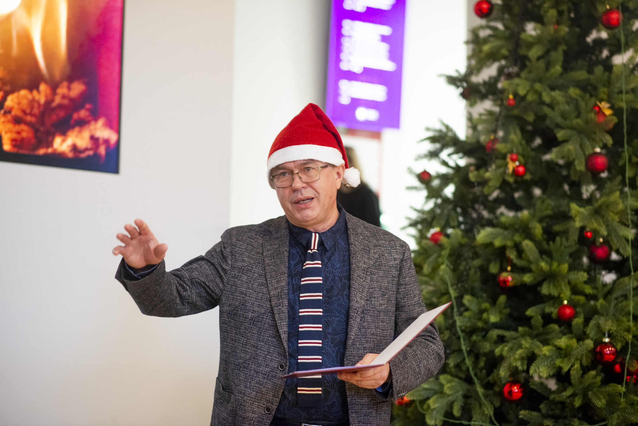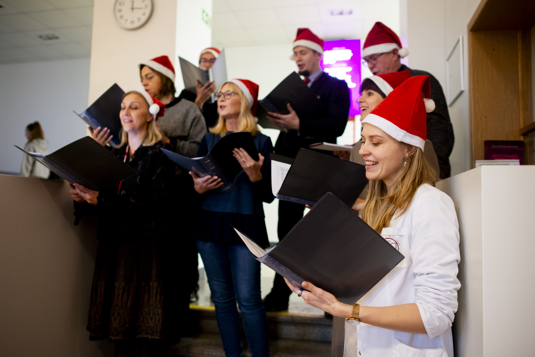 The Faculty community - staff and students - gathered in the lobby of the Faculty of Medicine at noon and lit the tree to the sound of the elf choir. The Dean of the Faculty of Medicine, Prof. Dalius Jatužis, greeted the participants and wished bright in the minds and hearts of everyone who came. The Dean also explained the history and meaning of the Christmas carol "Silent Night" and invited everyone to sing it together with the choir members. Even the foreign students of the Faculty of Medicine took it upon themselves to sing the carol, which has been translated into more than 300 world languages.